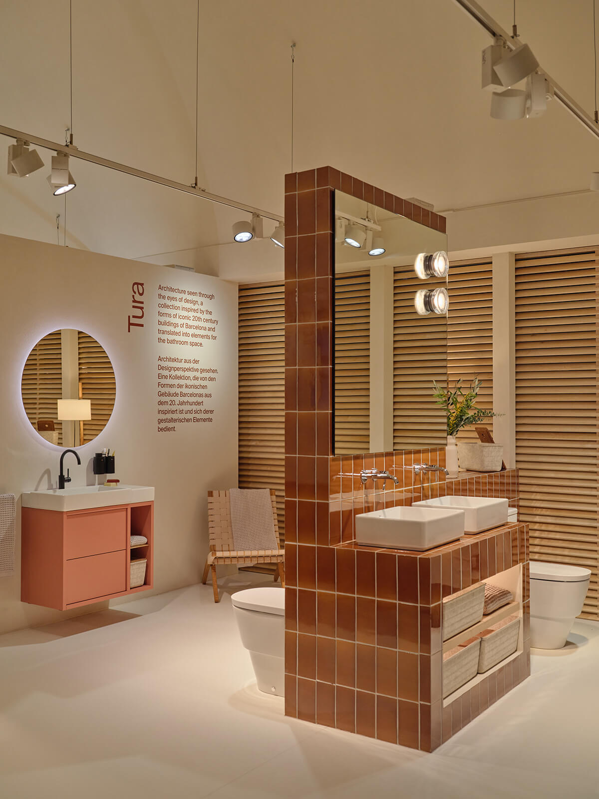 Mesura se ha inspirado en el trabajo de algunos de los grandes arquitectos de la Barcelona de mitad del siglo XX y en su forma de utilizar la luz y los materiales más sencillos para lograr gestos arquitectónicos poderosos. Las nuevas colecciones e innovaciones de Roca se exponen en torno a un patio central, que recuerda a la típica "plaza", donde los visitantes pueden reunirse e interactuar. Las contraventanas, también esenciales en la arquitectura mediterránea, desempeñan un papel importante en el diseño del stand. Dispuestas de tal manera que desde el exterior permiten vislumbrar el producto albergado en el stand, estas contraventanas crean un ambiente íntimo en el interior en el que destaca el juego de luces generado.